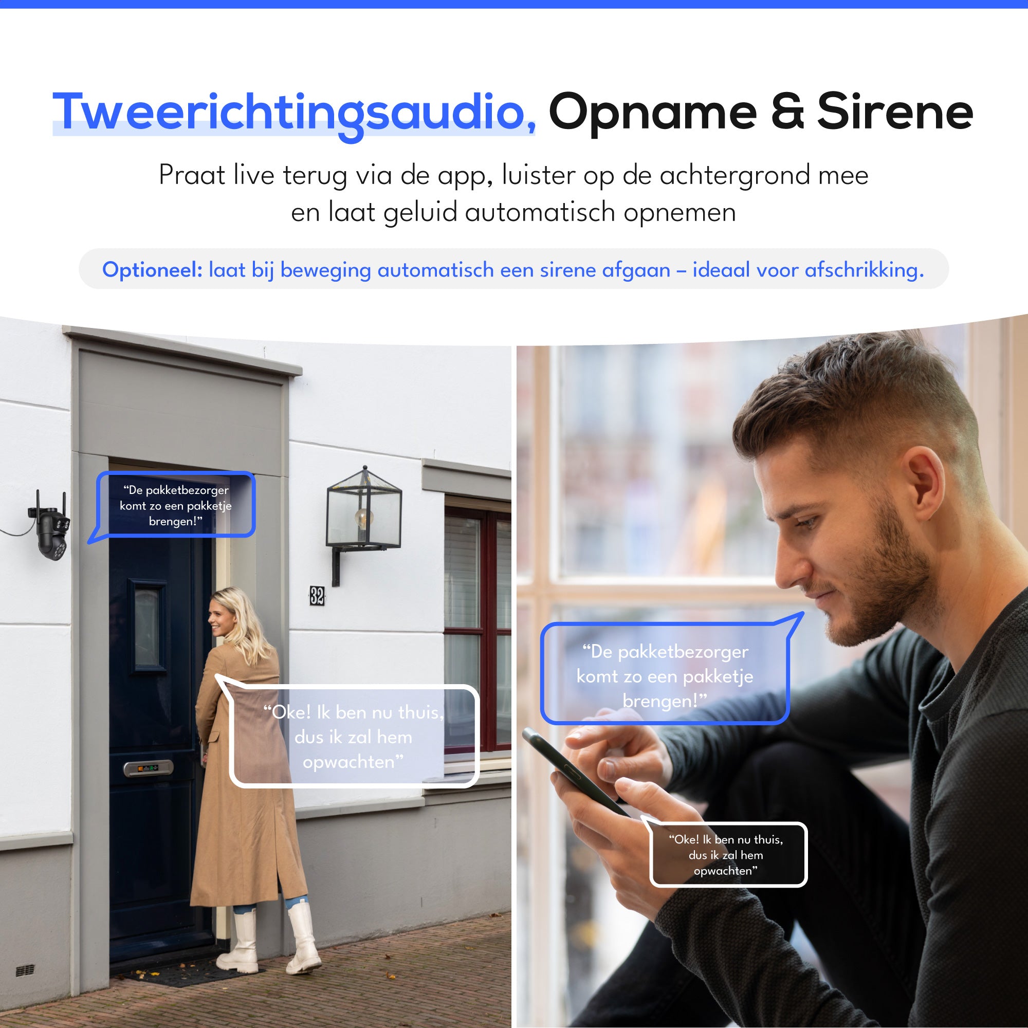 De ingebouwde floodlight staat paraat om indringers af te schrikken op basis van door jou ingestelde voorwaarden, en zorgt bovendien voor full color nachtzicht. Dankzij de tweeweg-audio kun je communiceren met iedereen in de buurt van de camera. Je bepaalt zelf hoe en wanneer de verlichting inschakelt, volledig naar jouw voorkeur.