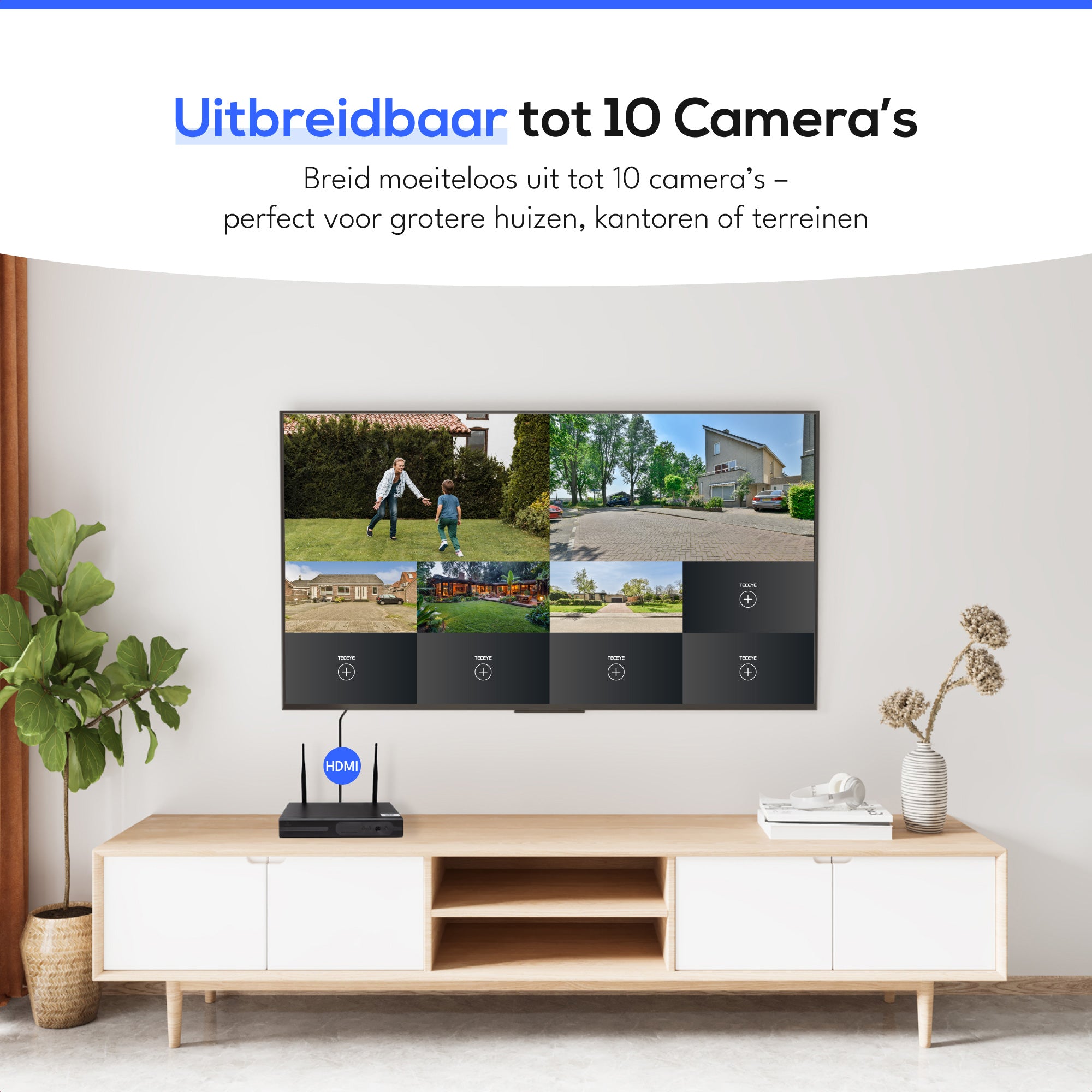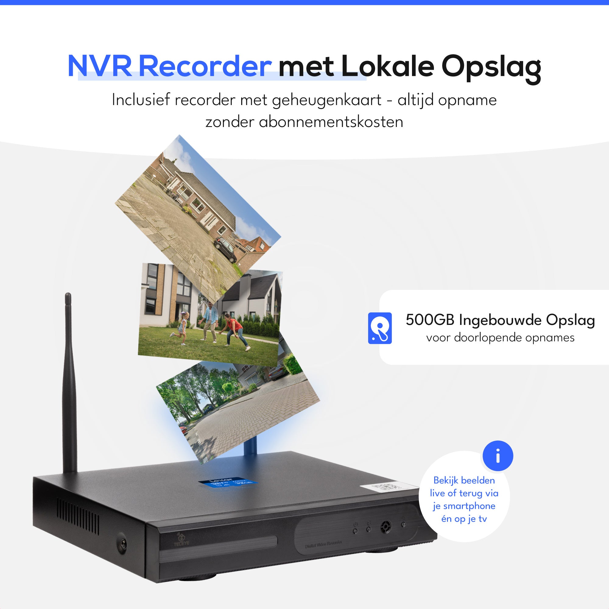 Met TecEye bepaal je zelf waar je videobeelden worden opgeslagen. Standaard wordt een 500GB harde schijfmeegeleverd die al je opnames lokaal bewaart, uitbreidbaar tot 2TB voor nog meer opslag. Daarnaast kun je kiezen voor een micro-SD-kaart in de camera of optioneel voor cloudopslag, zodat je beelden altijd veilig en toegankelijk blijven – zelfs als de camera zelf wordt beschadigd. Zo heb je altijd de controle, helemaal op jouw manier.